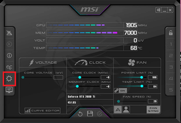 まずMSI Afterburnerを開いて、左側のメニューの下から2番目の歯車マークをクリック。