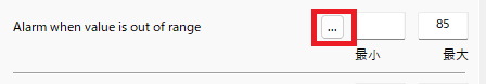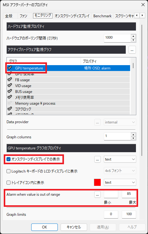 上のタブを「モニタリング」にして、「GPU temperature」の項目をクリックし、下の「Alarm when value is out of range」の最大側にこの温度を超えたら通知する温度を書き込みます。私は一旦85度にしています。最適な設定は自分で探しましょう。私もまだ模索してる。