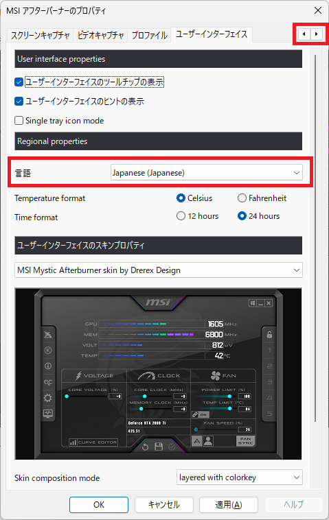 MSI Afterburnerが日本語になっていない人は右上の「▶」で上のタブを右側に動かして「ユーザーインターフェイス」を探して下さい。