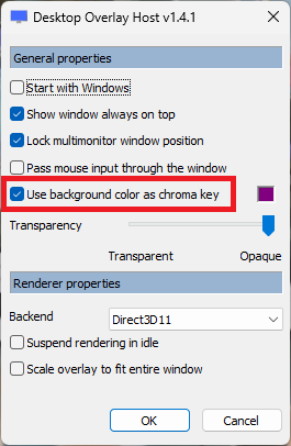「Use background color as chroma key」にチェックを入れると背景が透過されるようになります。設定はこれだけ。表示場所は表示されている文字をちゃんとクリックすればドラッグ&ドロップで好きな場所に配置できます。私は下のタスクバー上に置いてます。