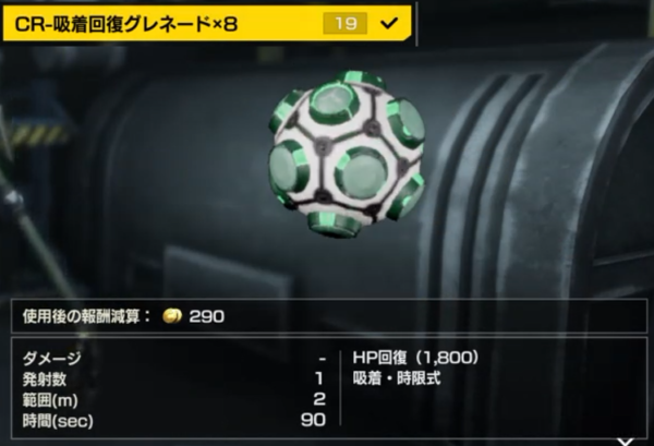 ①CR-吸着回復グレネード:ミッション10クリアで開放(グレネード)